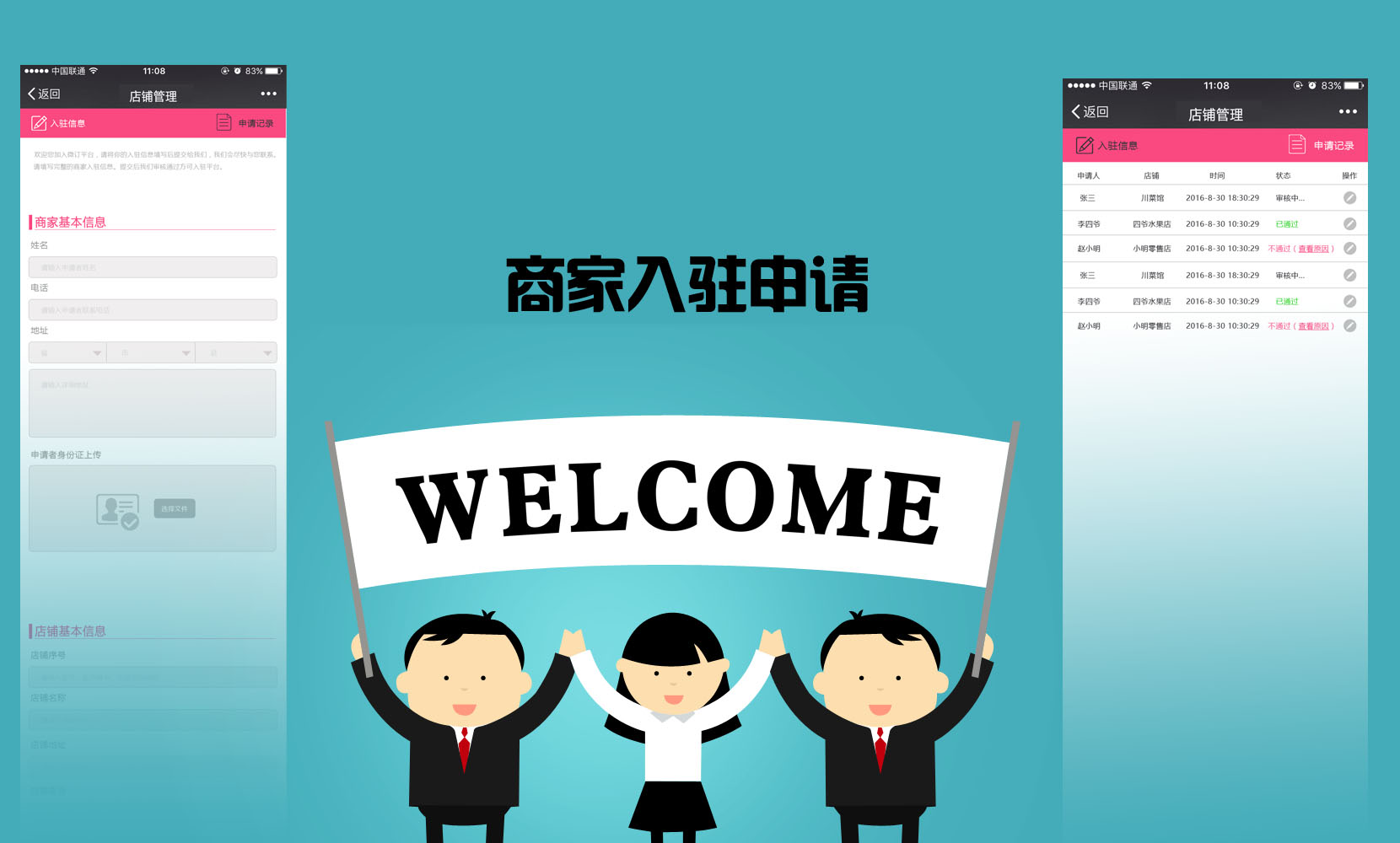商家可在线申请入驻,平台后台自动开通店铺和帐号。