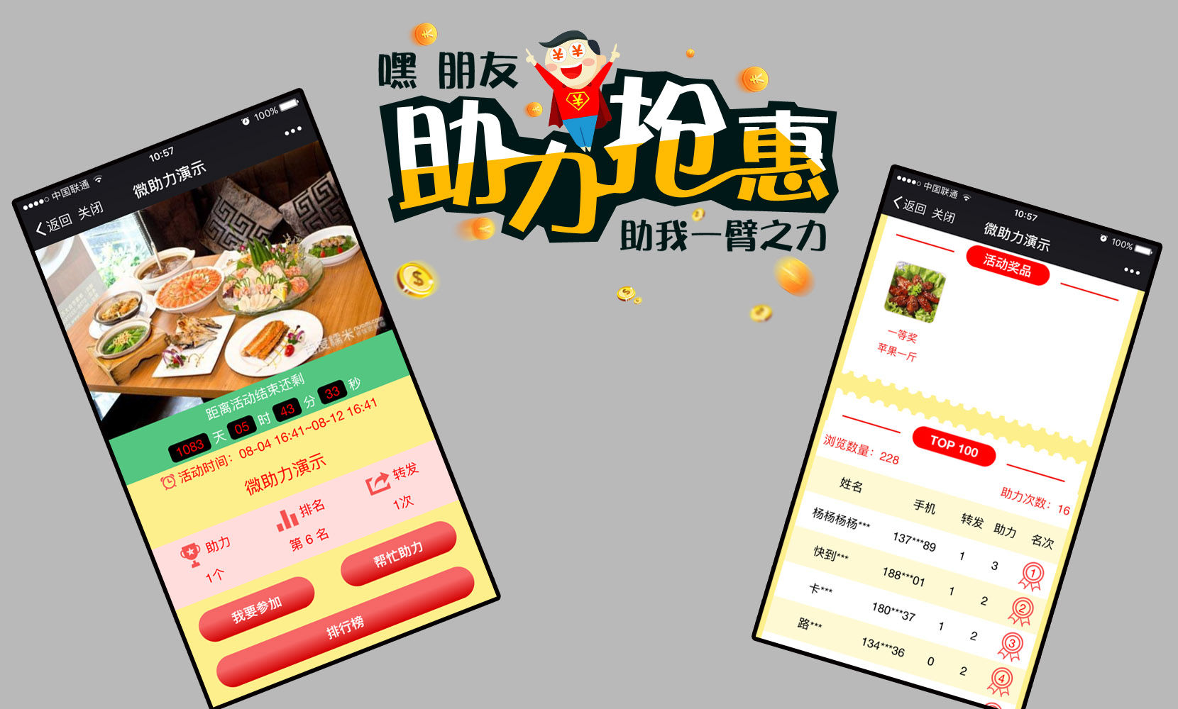 这是朋友圈一种快速传播的病毒,粉丝分享至朋友圈,根据好友点击排名,好友点击越多,排名越前;通过礼品刺激粉丝不停的邀请好友参加;好友看到也会自发的分享和参加,甚至为此不停的刷朋友圈,能够提高品牌曝光率和知名度。粉丝版用户可检测助力数,活动形式自由多变,数据检测准确实时,活动新颖,不仅能调动粉丝的活跃度,还能增加粉丝。