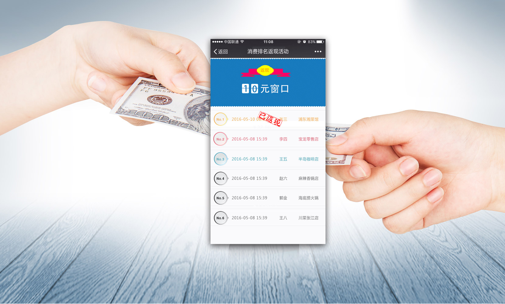 返现功能是根据用户消费金额,然后在指定金额窗口生成排名,根据后台设置,排名数量到达一定值之后,就给前几名返现。比如用户消费了180元,后台有10元、50元、100元窗口,那么在100元窗口会生成一条排名记录,在50元窗口会生成一条排名记录,而在10元窗口会生成3条排名记录。所有记录按时间前后排序!