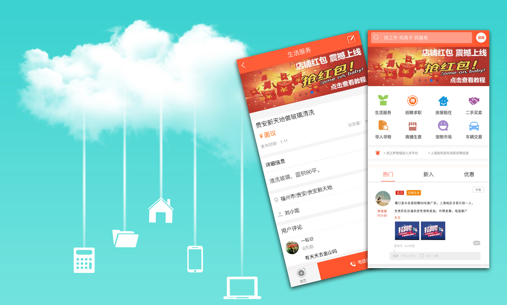集成二手市场、生活服务、招聘求职、拼车服务、房屋租售等一切本地化信息发布服务。